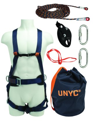 • Composé : d'un harnais COMFORT ; d'une corde gaînée tressée de 10m ; d'un anti-chute bloqueur coulissant ; de deux mousquetons acier ; d'un anneau d'ancrage en sangle d'1,00m et d'un sac de transport capacité 20L