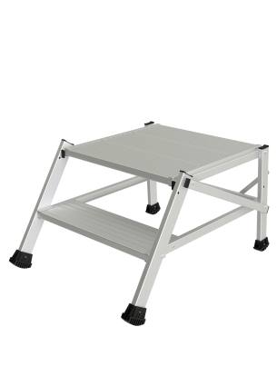 Ce marchepied extra large en aluminium avec ses marches de 200 mm et sa plate-forme de 600 x 600 mm offre à ses utilisateurs une plate-forme de travail d'une hauteur maximum de 0,49 m à 0,98 m. Avec sa structure renforcée, ses marches, sa plate-forme striée et ses sabots renforcés, le PODIUM est un marchepied des plus sécurisés. Disponible avec garde-corps et répond à la norme EN 14183 et au décret 96333.